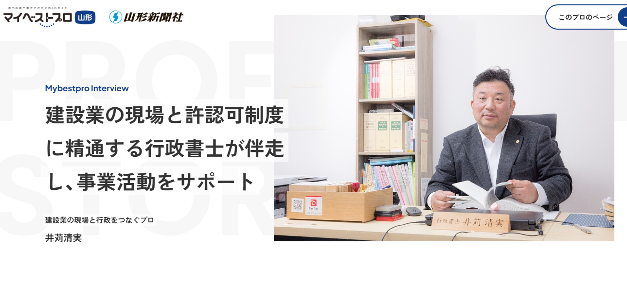 行政書士事務所みらい(山形市)の代表行政書士 井苅清実 が、山形新聞社が運営する専門家紹介サイト 「マイベストプロ山形」 に掲載されました。建設業許可を中心に、要件確認から書類作成、行政対応まで“手戻りを減らす申請”を支援します。